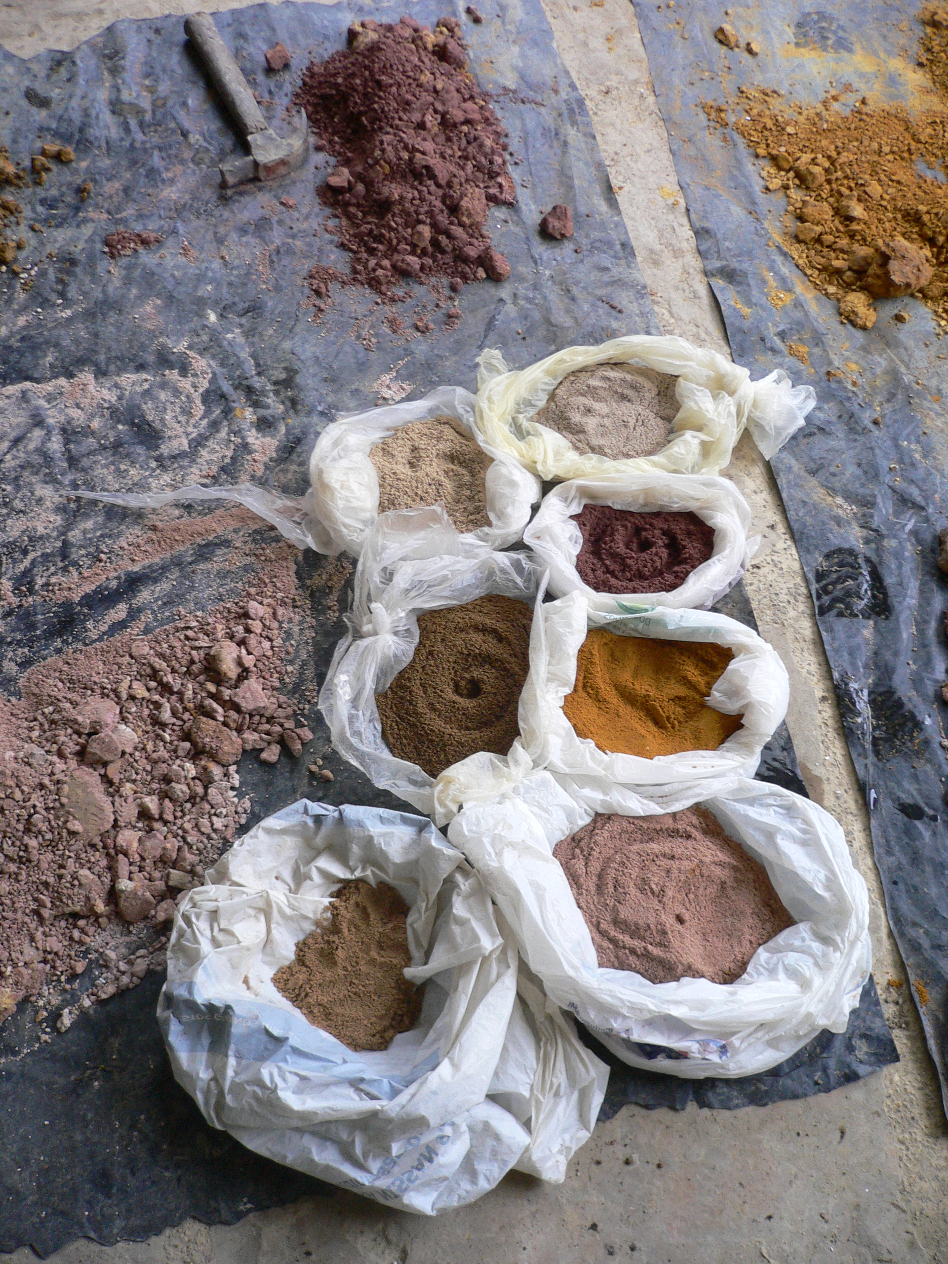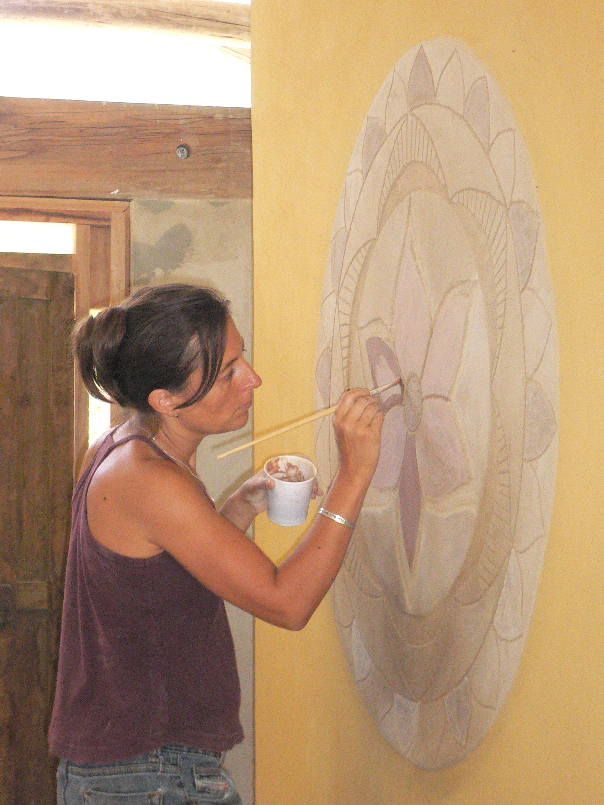 En Colombie, j’ai aussi récolté quelques terres locales et j’ai réalisé mon premier Mandala mural en alliant le Sgraffito et la peinture à base de pigments naturels.