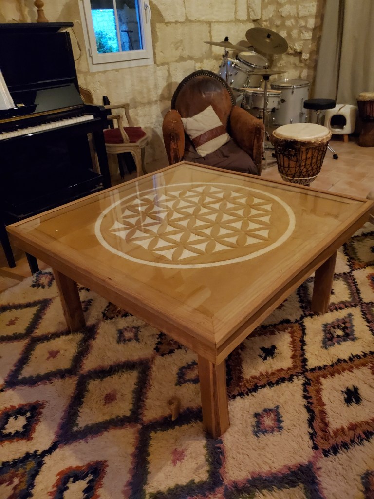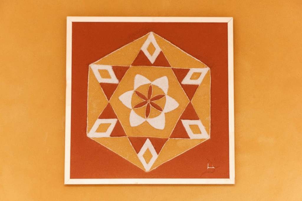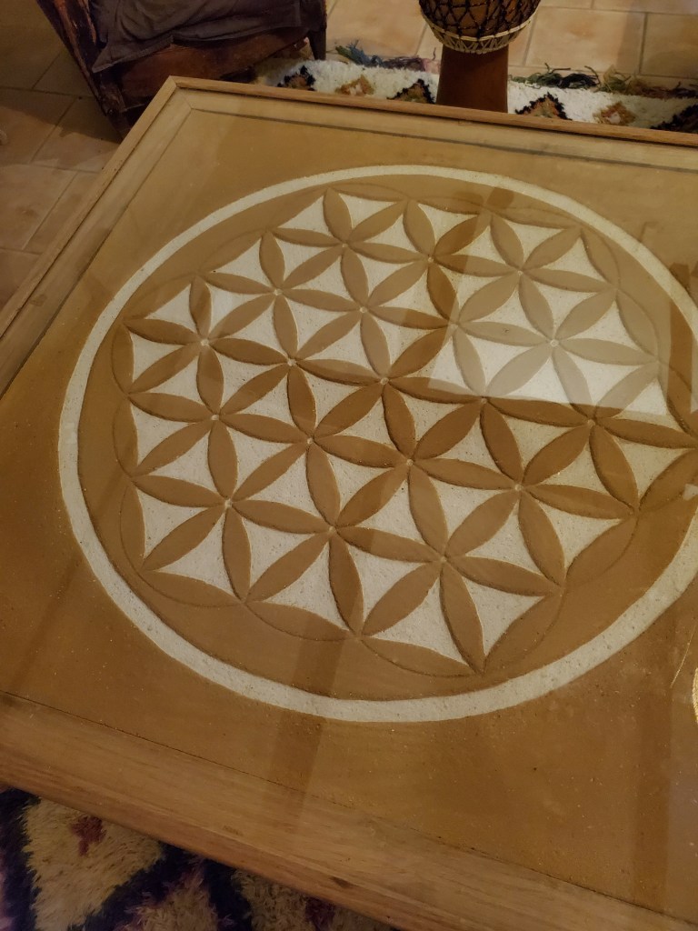 Lors d’un voyage au Maroc, j’ai créé pour un ami propriétaire d’un Riad mon premier grand Mandala à la peinture, avec les pigments que j’ai obtenu en filtrant très finement des terres du pays récoltées.