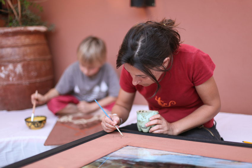 Lors d’un voyage au Maroc, j’ai créé pour un ami propriétaire d’un Riad mon premier grand Mandala à la peinture, avec les pigments que j’ai obtenu en filtrant très finement des terres du pays récoltées.